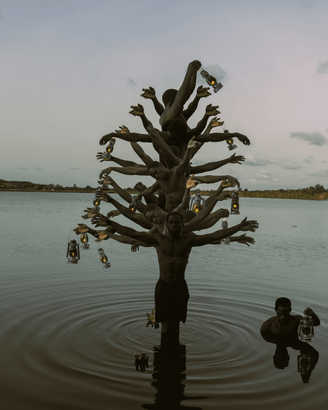 Nana Frimpong Oduro is a photographer and art director born in 1996 in Tema, Ghana, whose universe draws inspiration from surrealism. The artist creates dark-toned compositions where the human figure emerges from water, embodying fluidity, emotion, and depth. Like a visual poem, Nana Frimpong Oduro materializes the human condition, exploring themes of interdependence, solidarity, and hope.