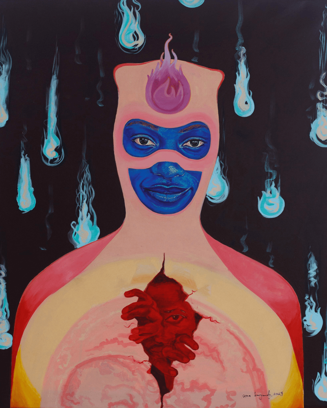 Ghanaian painter born in 1997, Sena Kofi Appau, also known as Sena Burgundy, explores self-awareness through his practice, depicting blue figures as symbols of universal introspection. Inspired by the philosophy "nosce te" (know thyself), he blends imagination and realism to create dreamlike landscapes where dreams take shape. Sena Burgundy’s pictorial universe, influenced by cinema and music, offers a glimpse into his quest for identity and understanding of the world.