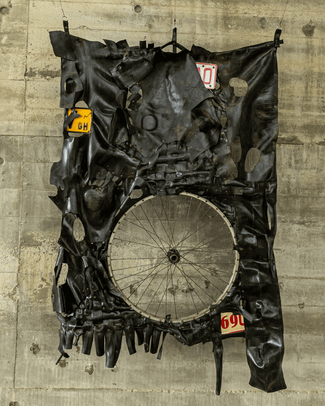 Dela Anyah, born in 1986 in Accra, Ghana, is a multidisciplinary artist who creates works from worn-out tires, inner tubes, and license plates. Reinterpreting traditional African weaving techniques, the artist crafts abstract compositions where each material’s deterioration tells a story. Through his work, Dela Anyah invites us to reconsider the value and beauty of forgotten materials while highlighting humanity’s dependence on machines.